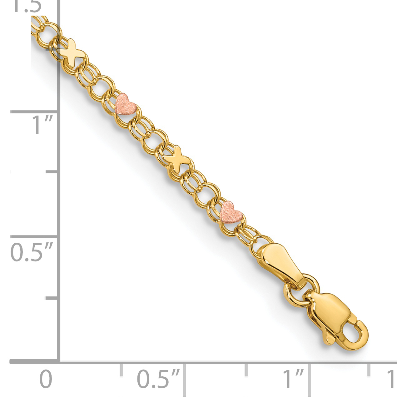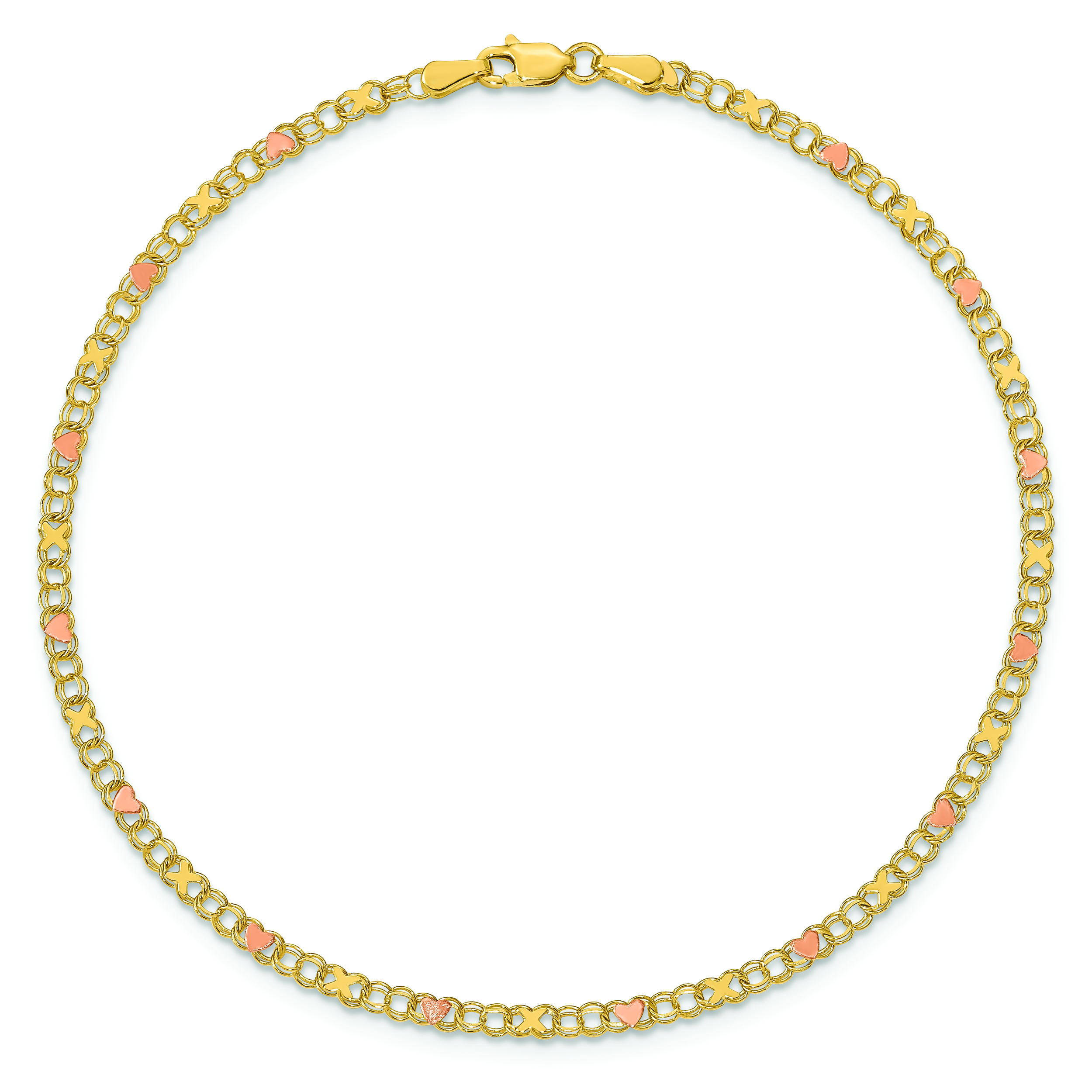 14k Polished and Satin Rose-plated X-and-Heart 10 inch Anklet