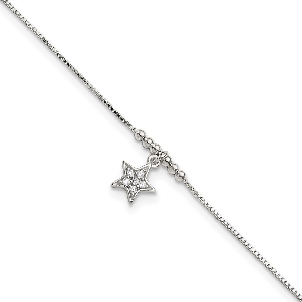 Sterling Silver CZ Star and Beads 9in Plus 1in Ext. Anklet