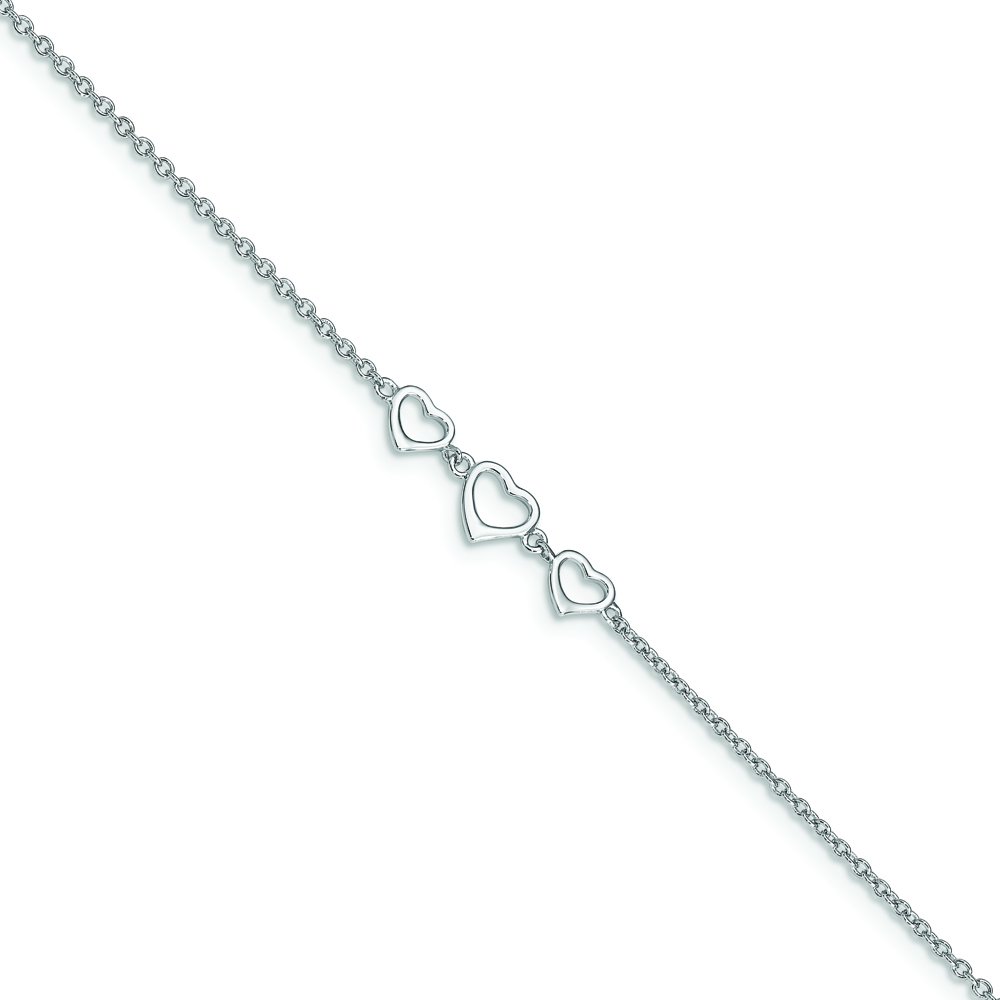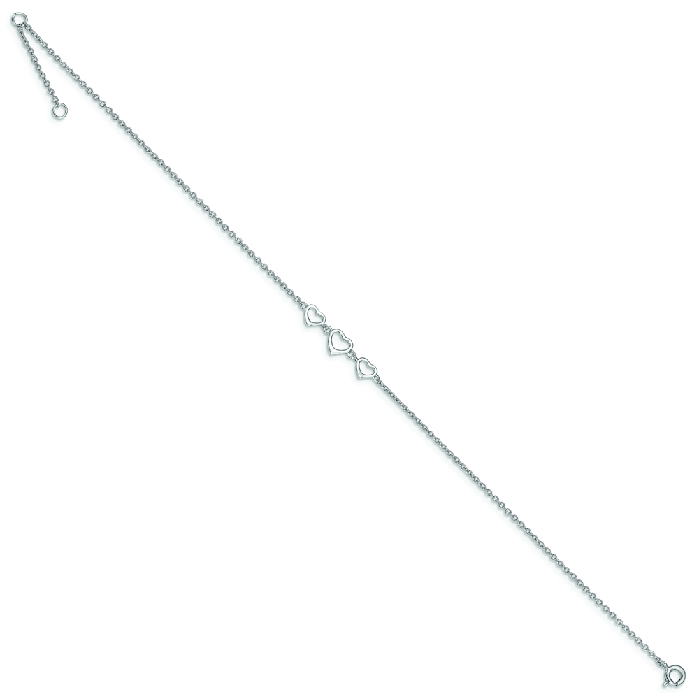 Sterling Silver Rhodium-plated Three Hearts 10 inch Plus 1 inch Extender – Total 11 inch Anklet